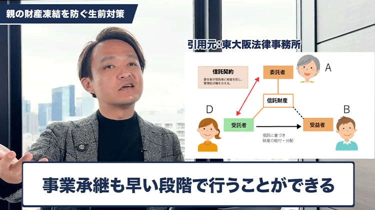 生前から凍結せずに管理ができるし、会社なら自社株も信じて託すことができます。